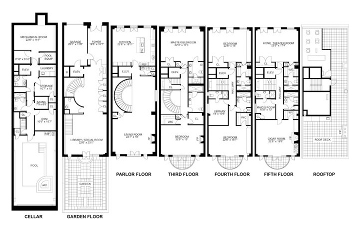 At the rear of the ground floor a glitzy mahogany-paneled library/lounge has herringbone patterned cherry wood floors, built in display cases, gilt-edged architectural details, and French doors to a planted garden outfitted with surround sound?bet the neighbors love that?and a built-in gas grill. Floor plans for the house indicate that a staircase in the library/lounge descends to the cellar level that contains the service and mechanical areas, significant storage space, and a spa facility complete with sauna, bathroom, fitness room, and theatrically-tiled indoor swimming pool and whirlpool area with built-in snack counter/wet bar.